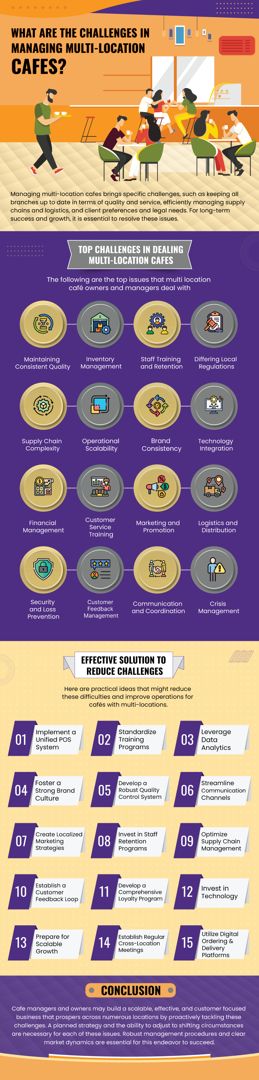 Managing multi-location cafes brings specific challenges, such as keeping all branches up to date in terms of quality and service, efficiently managing supply chains and logistics, and client preferences and legal needs. For long-term success and growth, it is essential to resolve these issues.