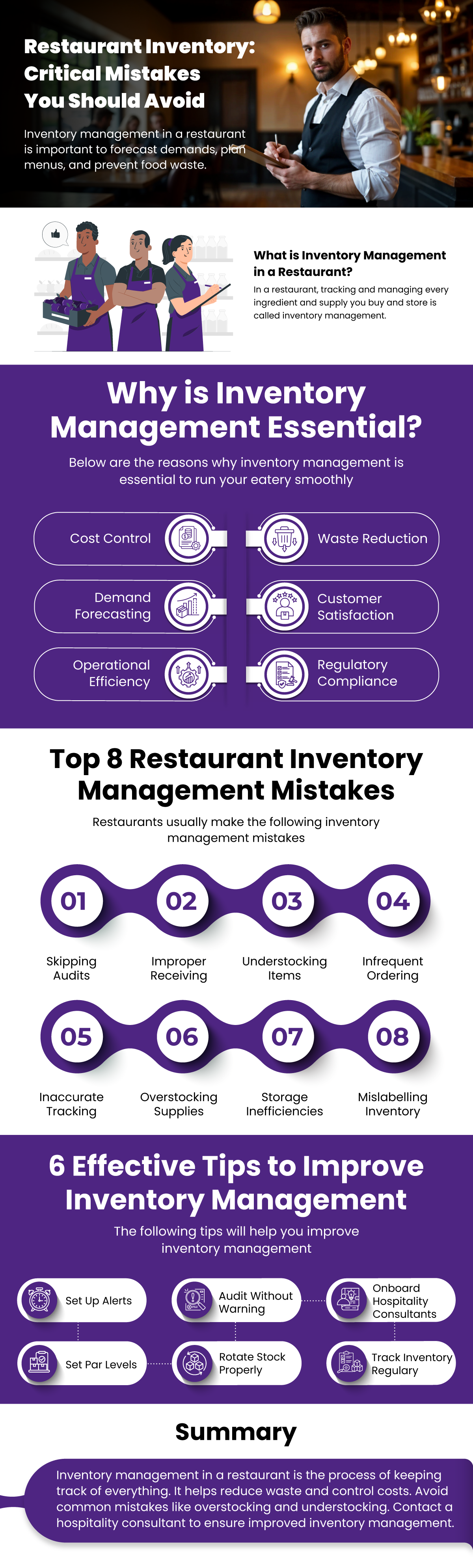 Inventory management in a restaurant is the process of keeping track of everything. It helps reduce waste and control costs. Avoid common mistakes like overstocking and understocking. Contact a hospitality consultant to ensure improved inventory management.
