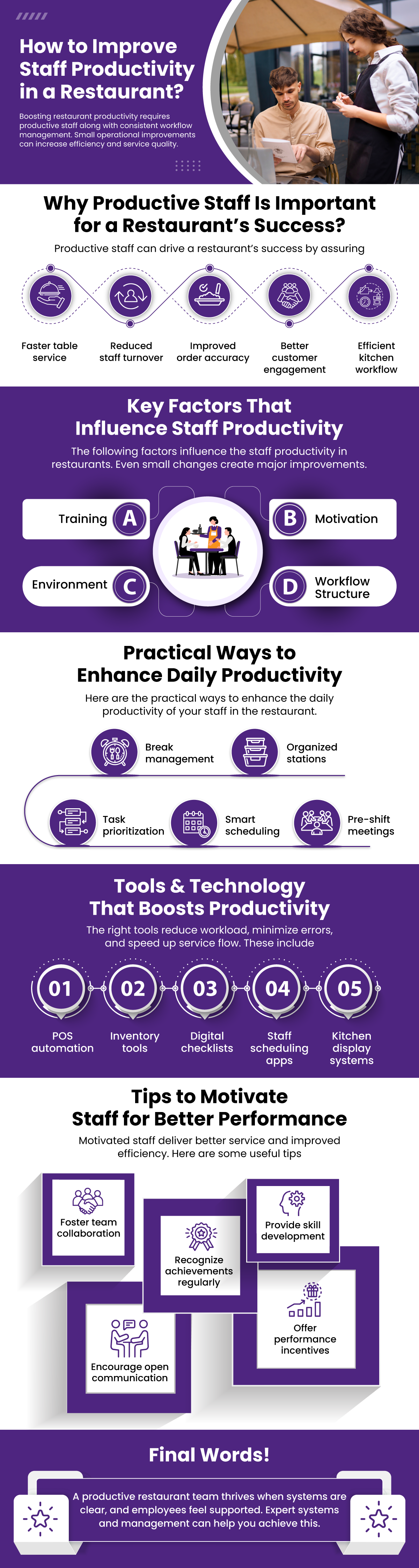Enhancing staff productivity in restaurants requires a balanced approach that blends structured processes, focused training, and supportive leadership. When employees have clear expectations, organized workstations, and the right tools, their efficiency naturally improves. This creates smoother service flow and better customer experiences.